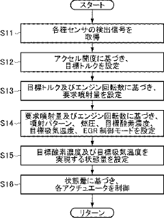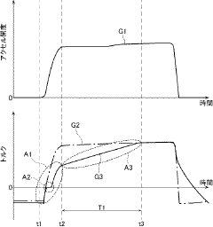 - An engine control device that adjusts engine torque based on accelerator operation, changing the torque rate according to accelerator depression speed and maintaining a slower rate of change after the pedal is fully depressed to extend the perception of acceleration.