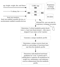 - A calorie optimization respiratory exchange (CORE) metabolic profile system and method that uses biometric data from wearable devices and previous respiratory exchange tests to generate individualized metabolic profiles, exercise heart rate zones, and nutritional guidelines, accessible through a website or mobile app, providing a cost-effective alternative for nutrition and diet planning.
