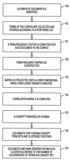 - The method employs latent semantic analysis (LSA) to project term-frequency matrices into a lower dimensional space, creating a correlation matrix and concept graph, allowing for clustering of documents based on concept occurrence and ranking by frequency within concept sets, using techniques like Singular Value Decomposition and hierarchical agglomerative clustering.