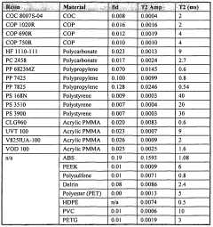 - The use of polymeric materials for NMR sample containers, such as plastics, which can be fabricated using methods like injection molding, allowing for the creation of complex designs at a lower cost, and the application of radiofrequency pulse sequences to differentiate and reduce the contribution of the container's signal in NMR measurements.