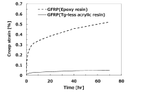 - A composite material using a cured acrylic resin composition with a maximum loss tangent tan δ of 0.12 or less, combined with reinforcing fibers, allows for low-temperature curing and reduces creep phenomena, making it suitable for both small and large-sized parts.