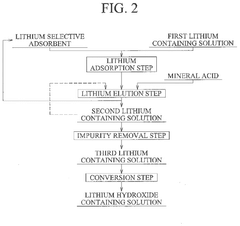 - A method involving lithium adsorption, elution, impurity removal steps including carbonation, neutralization, and ion exchange, followed by conversion to produce high-purity lithium hydroxide, which includes specific steps like oxidation, acid solution dissolution, and crystallization to enhance purity and reduce facility costs.