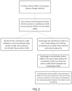 - The development of phase-change microvalves using a thin paraffin membrane sandwiched between microfluidic flow sections, actuated by heat to control fluid flow without pressure differentials, allowing for efficient fabrication and operation with tissue sectioning instruments, and featuring a unique property where the entire membrane melts to displace within the system while remaining sealed outside, preventing leakage.