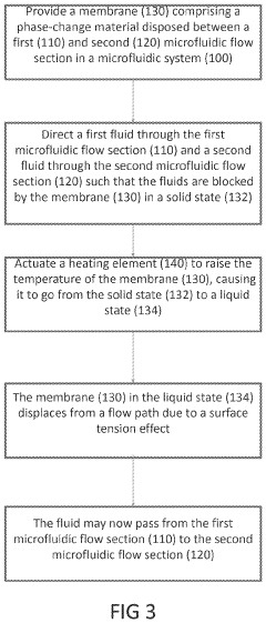Incorporating advanced sensing and control systems into microfluidic platforms enables real-time monitoring and adjustment of process parameters. These integrated systems use feedback mechanisms to optimize flow rates, reaction conditions, and mixing efficiency. Sensors embedded within the microfluidic architecture provide continuous data on temperature, pressure, and chemical composition, allowing for automated adjustments that maintain optimal operating conditions and improve overall system efficiency.Expand Specific Solutions03 Novel materials for microfluidic device fabrication