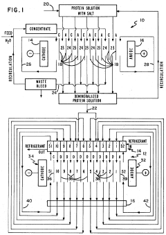 - The integration of electrodialysis before isoelectric focusing allows for controlled salt removal, creating a stable protein mixture that can be efficiently focused, using an electrodialysis cell with ion permselective membranes to separate salts and a subsequent isoelectric focusing cell with a pH gradient and permeable membranes to facilitate protein separation.