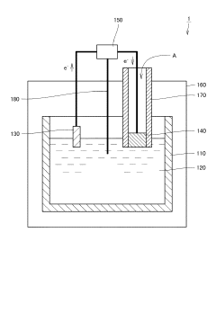 The design of electrode architectures significantly impacts NRR performance by affecting mass transport, charge transfer, and catalyst utilization. Hierarchical porous structures, 3D electrodes, and advanced substrate engineering can enhance the accessibility of active sites while maintaining electrical conductivity. Interface engineering between the catalyst and electrolyte is crucial for controlling local reaction environments, including pH gradients and electric field distributions. Optimizing the hydrophilicity/hydrophobicity balance at the electrode surface can facilitate N2 access to active sites while managing proton availability, thereby reducing overpotential and improving selectivity over competing reactions.Expand Specific Solutions05 Electrolyte composition and reaction environment control