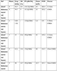 - The development of a low power millimeter wave (mmWave) multi-phase inductor-coupled ring oscillator that utilizes passive components to create phase differences, reducing noise and complexity, while achieving sub-mW power consumption through a simple topology with single differential inductors and two single-stage active delay cells.