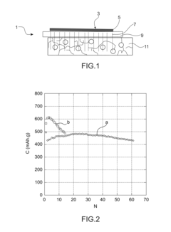 - A current collector-electrode assembly is developed with an elastic polymer layer connecting the silicon electrode and current collector, which absorbs deformations and maintains the interface integrity, using a combination of thermoplastic, thermosetting, and elastomeric polymers, along with carbon nanotubes for electrical connection and flexibility.