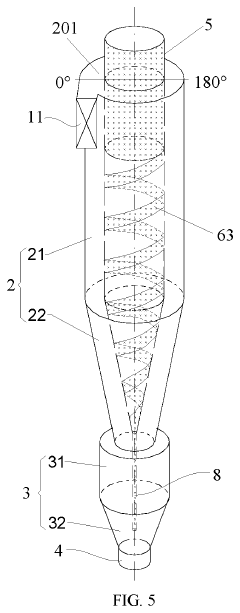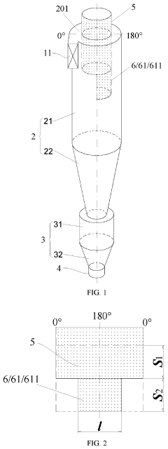 - Scale prevention and removal mechanisms: To address the issue of scale buildup in cyclone separators, innovative mechanisms have been developed. These include self-cleaning features, anti-scaling coatings, and integrated scale removal systems. Some designs incorporate vibration or ultrasonic devices to prevent scale formation or facilitate its removal during operation.