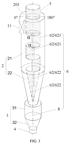 Incorporation of scale prevention mechanisms within cyclone separators to minimize scale buildup and enhance long-term performance. These mechanisms may include anti-scaling coatings, ultrasonic vibration systems, or chemical injection ports to prevent scale formation on internal surfaces.Expand Specific Solutions03 Multi-stage cyclone systems for improved scale separation