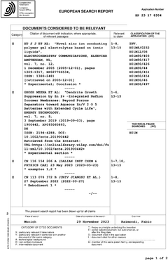 Nanofiber-based separators manufactured through electrospinning or other nanofabrication techniques provide exceptional porosity and surface area for zinc-ion batteries. These separators feature interconnected pore structures with diameters typically ranging from 50-500 nm, facilitating efficient ion transport while maintaining mechanical strength. The high surface-to-volume ratio enhances electrolyte wetting and retention. Various polymers including PVA, PAN, PVDF, and cellulose derivatives can be processed into nanofibers with tailored porosity and wetting properties specific to zinc-ion battery applications.Expand Specific Solutions05 Gel polymer electrolyte separators