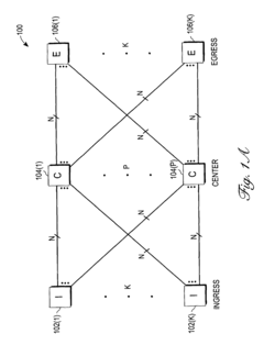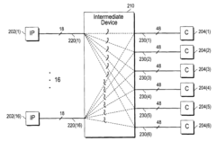 - The introduction of a distribution stage between the first and second stages of a switching network, which distributes bandwidth units from each first stage switching device to each second stage switching device, ensuring each second stage device receives at least one unit, thereby allowing the center stage and overall array to be more freely expanded without degrading switching performance or increasing complexity.