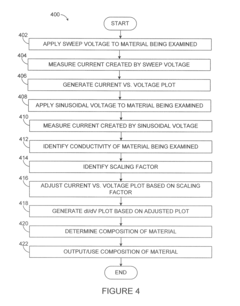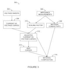 - The method involves combining cyclic voltammetry and impedance measurements to adjust data for contamination effects, using a scaling factor derived from impedance measurements to normalize current versus voltage curves, and generate a current derivative curve for accurate material composition determination.