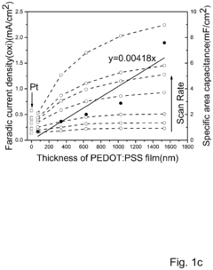 - A novel electrode system comprising a polymer electrode with both electron and proton conductive phases, specifically using doped poly(3,4-ethylenedioxythiophene) (PEDOT) as the electron conductor and polystyrene sulfonate (PSS) as the proton conductor, which facilitates high reversibility and efficient electrochemical conversion of molecules like benzenediols, reducing overpotential and enhancing current density.