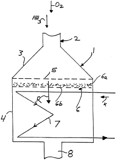 - Passing reaction gases over a temperature-stable catalyst downstream of the catalyst gauze before cooling, allowing for the conversion of N2O into nitrogen and oxygen or nitric oxide, utilizing a highly active catalyst such as doped ceramics or noble metals to promote oxidation of N2O to NO2, thereby increasing nitric acid production without requiring separate heating.