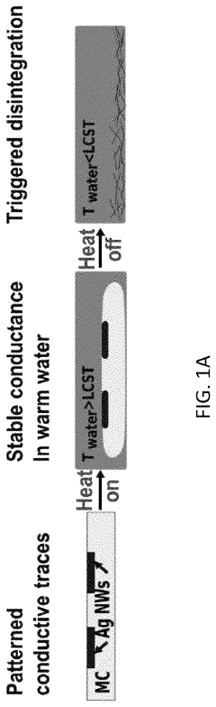 - Employing thermoresponsive materials with lower critical solution temperature (LCST) behavior, such as methyl cellulose (MC) and poly(N-isopropylacrylamide) (PNIPAm) polymers combined with silver nanowires (AgNWs) to create composite elements where electrical traces are embedded or surface-disposed, enabling stable function in warm environments and rapid disintegration upon cooling.