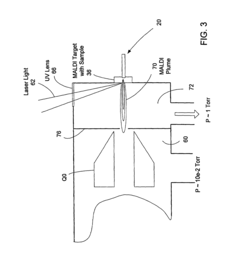 - A MALDI ion source is coupled with a triple-quadrupole mass analyzer, utilizing high-frequency laser pulses to generate collisionally cooled ions, allowing for rapid data acquisition and improved sensitivity through the multiple-reaction-monitoring (MRM) mode, decoupling ion beam characteristics from source conditions and enabling high mass resolution and sensitivity.