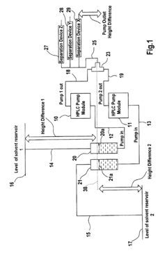 Technical Solution: Waters has developed a comprehensive technology solution that addresses the fundamental differences between HPLC and PrepLC systems. Their ACQUITY UPLC and prep LC systems feature patented column technology that optimizes particle size distribution - typically using sub-2μm particles for HPLC for analytical precision and larger particles (5-10μm) for PrepLC to handle higher sample loads. Waters' AutoPurification System integrates mass detection with optical detection for PrepLC, enabling throughput increases of up to 30-fold compared to traditional methods. Their systems implement dynamic flow adjustment technology that automatically optimizes flow rates based on column dimensions and separation requirements, allowing seamless method transfer between analytical and preparative scales. Waters' Prep Calculator software provides automated scaling calculations to translate HPLC methods to PrepLC parameters with minimal manual optimization.
