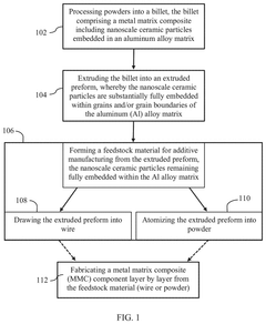 Technical Solution: RTX Corp. (formerly Raytheon Technologies) has pioneered a hybrid additive manufacturing approach for MMCs that integrates directed energy deposition (DED) with friction stir processing (FSP). Their system utilizes a multi-material deposition head capable of precisely controlling the distribution of reinforcement particles within the metal matrix. The process begins with DED to create near-net-shape components with controlled reinforcement distribution, followed by FSP to refine the microstructure and eliminate porosity. RTX's technology incorporates real-time adaptive control systems that monitor thermal conditions and adjust processing parameters accordingly, ensuring consistent material properties throughout complex geometries. This approach has been particularly successful for high-temperature aerospace applications, including missile components and propulsion systems. RTX has documented improvements in thermal stability up to 200°C higher than conventional alloys, while maintaining excellent mechanical properties and corrosion resistance. The company has also developed specialized post-processing techniques to optimize surface finish and dimensional accuracy.