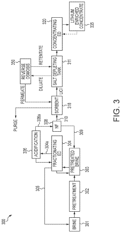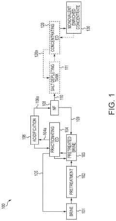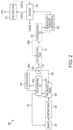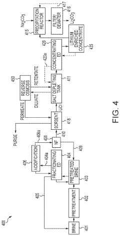 Efficient regeneration processes are crucial for the economic viability of hybrid membrane-sorbent systems. These processes involve the desorption of lithium from sorbent materials and cleaning of membrane surfaces to restore their original performance. Various regeneration methods include pH adjustment, chemical washing, and electrochemical techniques. Optimized regeneration cycles minimize chemical consumption and waste generation while maximizing the operational lifetime of both membrane and sorbent components.Expand Specific Solutions05 Novel composite materials for enhanced lithium selectivity