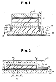 Technical Solution: Merck Patent GmbH has pioneered hybrid Peltier devices utilizing specially engineered organic semiconductor materials with enhanced thermoelectric properties. Their approach focuses on developing novel organic small molecules and polymers with optimized HOMO-LUMO energy levels to maximize the Seebeck coefficient while maintaining adequate electrical conductivity. Merck's technology incorporates multiple alternating layers of n-type and p-type organic semiconductors with precisely controlled doping profiles to create efficient thermoelectric junctions. The company has developed proprietary interface engineering techniques to minimize contact resistance between organic and inorganic components, a critical factor in hybrid device performance. Their solution includes specialized encapsulation methods to protect organic layers from environmental degradation, extending device lifetime to over 5,000 hours of continuous operation. Merck's hybrid devices achieve a figure of merit (ZT) of approximately 0.6 at room temperature, representing a significant improvement over conventional organic-only thermoelectric materials.