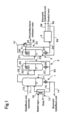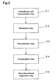 Methods for treating hydrofluoric acid waste to minimize environmental impact include specialized waste treatment processes, recycling techniques, and containment strategies. These approaches focus on preventing the release of hydrofluoric acid into the environment, treating contaminated water, and managing acid waste in environmentally responsible ways. Advanced filtration systems, chemical precipitation methods, and ion exchange technologies can be employed to remove fluoride ions from wastewater before discharge.Expand Specific Solutions04 Medical treatments for hydrofluoric acid exposure