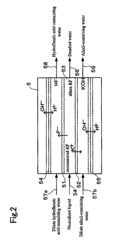 - A method involving concentration by evaporation, followed by dissolution with water, neutralization with an alkali, and condensation, utilizing ion exchange membranes to separate hydrofluoric acid-containing water, alkali-containing water, and desalted water, effectively recovering hydrofluoric acid and reducing its concentration in the treated water.