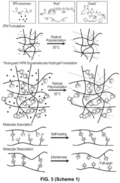 Advanced polymer compositions have been developed to extend the antimicrobial lifetime of hydrogels. These include nanocomposite hydrogels, interpenetrating polymer networks, and hybrid materials combining synthetic and natural polymers. Such compositions can enhance mechanical stability while providing controlled degradation profiles. Additionally, incorporating secondary mechanisms such as self-healing properties or stimuli-responsive elements can further extend functional lifetime, maintaining antimicrobial efficacy over longer periods.Expand Specific Solutions05 Monitoring and predicting hydrogel degradation and antimicrobial performance