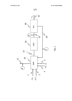 Strengths: Extensive hydrogen infrastructure network providing reliable supply; advanced purification technologies ensuring catalyst-friendly hydrogen; demonstrated experience in large-scale hydrogen projects across both pathways. Weaknesses: Green hydrogen production capacity still limited compared to SMR-based production; geographic constraints on hydrogen delivery networks; higher costs for green hydrogen pathway compared to SMR-CCS in most regions.