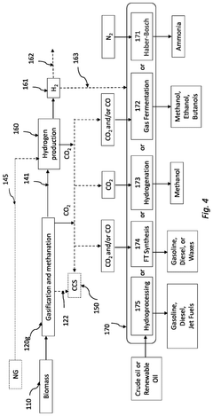 Technical Solution: Air Products has pioneered a comprehensive hydrogen supply strategy for hydrogenolysis applications through their dual-pathway approach. Their green hydrogen portfolio centers around PEM and alkaline electrolysis technologies scaled to industrial levels, with their flagship projects achieving electrolyzer efficiencies of 70-75% (LHV basis). For hydrogenolysis applications specifically, they've developed modular hydrogen supply units that can be integrated directly with processing facilities, reducing transportation losses and ensuring pressure-optimized delivery. Their SMR-CCS technology utilizes proprietary pressure swing adsorption systems achieving hydrogen purities exceeding 99.999%, critical for catalyst longevity in hydrogenolysis processes. Their ECLIPSE™ carbon capture technology can be retrofitted to existing SMR units, capturing up to 98% of CO2 emissions while maintaining hydrogen production costs within 15-20% of unabated hydrogen. Air Products has also developed specialized hydrogen storage and compression systems designed specifically for the pressure and purity requirements of hydrogenolysis reactions, with their HyPure™ system ensuring contaminant levels below 10 ppb[2][4].
