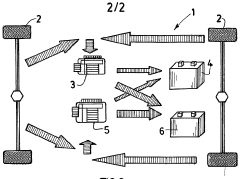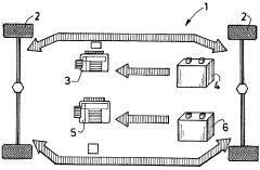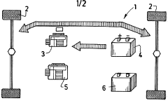 - A dual motor and battery system where one lithium-metal-polymer battery handles standard driving conditions and a higher-powered lithium-ion battery manages high acceleration and high-speed phases, with a transmission device and clutch allowing energy sharing between motors to optimize performance and extend battery life.