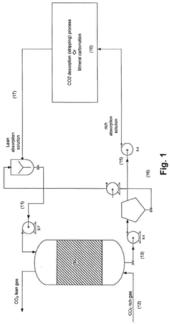 Catalytic methods enable the conversion of captured carbon dioxide into valuable products or more easily storable forms. These processes typically employ metal-based catalysts, such as transition metals or metal oxides, that facilitate chemical reactions with CO2 at lower activation energies. The catalytic conversion can transform CO2 into fuels, chemicals, or carbonates, providing both environmental benefits and economic incentives for carbon capture. Recent innovations focus on improving catalyst efficiency, selectivity, and durability while reducing the energy requirements for these conversion processes.Expand Specific Solutions03 Integrated capture and utilization systems