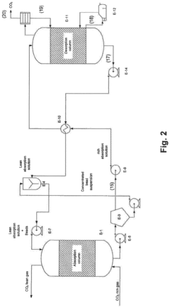- Process optimization and energy efficiency in CO2 capture: Process optimization techniques aim to reduce the energy requirements and improve the efficiency of CO2 capture systems. This includes the development of novel process configurations, heat integration strategies, and advanced control systems. Energy-efficient regeneration methods for sorbents and membranes are particularly important, as regeneration typically accounts for a significant portion of the energy consumption in capture processes. Innovations in this area focus on minimizing the parasitic energy load while maximizing capture efficiency.