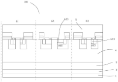 Silicon Carbide (SiC) MOSFETs have unique structural features and fabrication methods that enhance their performance characteristics. These include specialized gate structures, channel designs, and manufacturing techniques that improve electron mobility and reduce on-resistance. The fabrication processes often involve specific thermal oxidation steps, ion implantation techniques, and epitaxial growth methods tailored for SiC material properties to achieve high-quality gate oxide interfaces and optimal device performance.- SiC MOSFET structure and fabrication: Silicon Carbide (SiC) MOSFETs have unique structural features that enable their superior performance in power electronics. The fabrication process involves specialized techniques to create the gate oxide interface with the SiC substrate, which is critical for device reliability. Various methods are employed to reduce interface defects and improve channel mobility, including post-oxidation annealing treatments and specialized doping profiles. The structure typically includes trench or planar gate configurations with optimized field plate designs to manage electric field distribution.