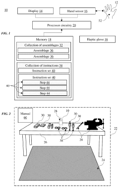 - A virtual reality system that guides users through a sequential list of assembly steps by highlighting tools and locations in a virtual work area, utilizing a haptic glove for tactile feedback to simulate surface finishes and detect issues like burrs during assembly.
