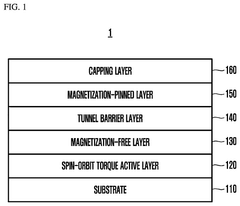 Insertion of ultrathin layers between the SOT generator and MTJ structure can significantly improve interface properties. These layers can serve as diffusion barriers, coupling enhancers, or spin mixing interfaces. Various modification techniques including oxygen plasma treatment, ion bombardment, and thermal annealing are employed to tailor the interface characteristics, resulting in enhanced spin current efficiency and reduced switching current requirements.Expand Specific Solutions04 Interface control for perpendicular magnetic anisotropy