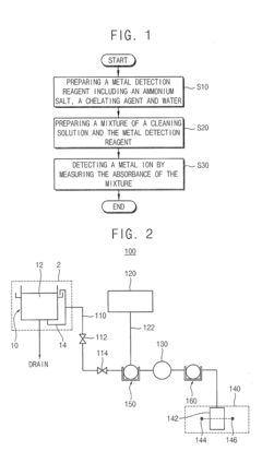 - Surface cleaning and metal removal: Ammonium hydroxide-based chelation is applied in surface cleaning processes to remove metal contaminants from various materials. This technique is particularly useful in electronics manufacturing and precision cleaning applications.