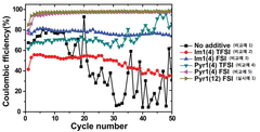 Technical Solution:  LG Energy Solution has developed advanced ionic liquid-based electrolyte systems specifically designed to control lithium dendrite growth in lithium metal batteries. Their approach incorporates fluorinated ionic liquids with high electrochemical stability windows (>5V vs Li/Li+) and excellent thermal stability up to 300°C. The company's proprietary formulation combines pyrrolidinium-based cations with TFSI anions, creating a robust SEI (Solid Electrolyte Interphase) layer that effectively suppresses dendrite formation. Their technology employs dual-salt systems where ionic liquids are mixed with conventional lithium salts (LiPF6, LiFSI) in optimized ratios to maintain high ionic conductivity (>3 mS/cm at room temperature) while preventing uneven lithium deposition. LG's solution also incorporates nano-engineered additives that promote uniform Li+ flux across the electrode surface, resulting in smooth, dendrite-free lithium plating even at high current densities (>3 mA/cm²).