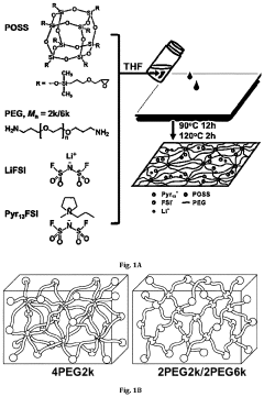 - A lithium gel polymer electrolyte composition is developed, featuring a crosslinked network formed by reacting inorganic polyhedral oligomeric silsesquioxane with functionalized poly(ethylene glycol or poly(ethylene oxide) and incorporating an ionic liquid and lithium salts, creating a mechanically stable hybrid network with enhanced ionic conductivity.