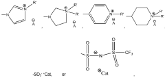 Ionic liquids are used in various electrochemical applications due to their excellent conductivity and stability. They serve as electrolytes in batteries, fuel cells, and supercapacitors, offering advantages such as wide electrochemical windows, low volatility, and high thermal stability. These properties make them superior alternatives to conventional electrolytes, enabling the development of more efficient and safer energy storage and conversion devices.- Ionic liquids in electrochemical applications: Ionic liquids are used in various electrochemical applications due to their excellent conductivity and stability. They serve as electrolytes in batteries, fuel cells, and other energy storage devices, offering advantages such as wide electrochemical windows, low volatility, and high thermal stability. These properties make them superior alternatives to conventional electrolytes, enabling the development of more efficient and safer electrochemical systems.