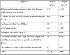 - A liquid photohardenable composition comprising a photohardenable resin, a dual-wavelength photoinitiator, and a thixotrope, with yield stress greater than 5 Pa and light transmittance above 90% for a 5 cm pathlength, maintaining clarity for at least 10 days, ensuring precise and clear curing.