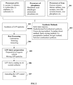 Innovative electrode manufacturing techniques can optimize the distribution of active materials and conductive additives in LFP cathodes. Methods such as freeze-drying, spray pyrolysis, or template-assisted synthesis can create electrodes with controlled porosity and optimized particle arrangement. Advanced mixing and coating processes ensure homogeneous distribution of components throughout the electrode. These manufacturing approaches can reduce agglomeration of particles, create efficient ion transport channels, and establish robust conductive networks, ultimately enhancing the rate performance and power density of LFP batteries.Expand Specific Solutions