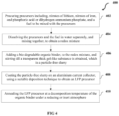 - A method using bio-degradable organic binders and solvents, specifically sodium carboxymethyl cellulose, sodium poly acrylic acid, or sodium alginate, to create an aqueous-based LFP precursor slurry, which is deposited on an aluminum foil current collector via blade coating, slot-die coating, or screen printing, followed by annealing under an inert atmosphere, bypassing energy-intensive synthesis and post-processing steps.
