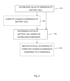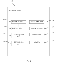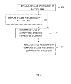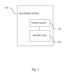 - Attaching a strain gauge, such as an ultra-high sensitivity graphene-based strain gauge, to the battery cell within an electronic device to measure dimensional changes, which are then compared to reference values and thresholds to determine the cell's status, allowing for precise monitoring of charge and discharge states.