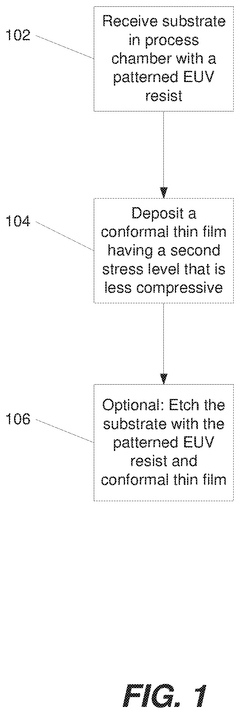 - Depositing a conformal thin film with a stress level less compressive than the EUV resist layer, using plasma-enhanced atomic layer deposition (ALD) to alter internal stress, thereby reducing buckling and bulging and decreasing low frequency roughness, while maintaining or improving the critical dimension of features.