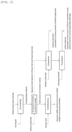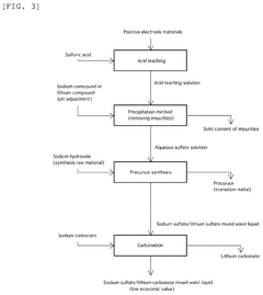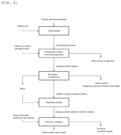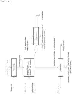 - Lithium compound conversion efficiency: Technologies for efficient conversion between different lithium compounds, particularly between lithium acetate and lithium sulfate, have been developed to optimize energy usage. These processes utilize catalysts, controlled reaction conditions, and recycling of reagents to minimize energy consumption during conversion steps. The efficient interconversion between these compounds is crucial for energy-efficient lithium battery material production.