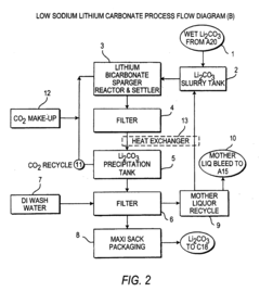 - Stability considerations in industrial applications: In industrial applications, the stability of lithium chloride and lithium carbonate is critical for process efficiency and product quality. These compounds must maintain their chemical integrity during extraction, purification, and conversion processes. Factors such as reaction kinetics, presence of impurities, and process conditions can affect stability. Industrial processes often incorporate specific stabilization steps, monitoring protocols, and quality control measures to ensure the consistent performance of these lithium compounds in applications ranging from battery production to pharmaceutical manufacturing.