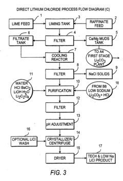 Technical Solution: Rockwood Lithium (now part of Albemarle Corporation) has developed proprietary processes for manufacturing high-purity lithium chloride with enhanced chemical stability. Their approach involves controlled precipitation techniques that minimize impurities and reduce moisture sensitivity. The company has pioneered a multi-stage purification system that achieves 99.9% purity lithium chloride with significantly improved shelf life compared to conventional products. Their research demonstrates that properly stabilized lithium chloride can maintain consistent performance in battery applications despite its hygroscopic nature. Rockwood has also developed specialized packaging and handling protocols to preserve the chemical integrity of lithium chloride during transportation and storage, addressing one of the key challenges in its industrial application.