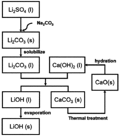- A method involving dissolving calcium hydroxide in water to create an aqueous solution, then reacting it with lithium carbonate at controlled temperatures (50°C to 100°C) to produce lithium hydroxide, optimizing the amount of lithium carbonate added (16 to 87 g/L) to maximize conversion rates and minimize waste, while concentrating the solution to precipitate lithium hydroxide efficiently.
