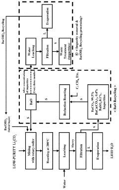 Technical Solution: Toyota has developed an innovative approach to lithium hydroxide reaction optimization focused on environmental sustainability and efficiency for their battery supply chain. Their technology employs a hybrid batch-continuous process that optimizes reaction conditions through precise control of solution chemistry and thermal management. The system utilizes a proprietary reactor design that enhances mixing efficiency while minimizing energy consumption through advanced heat recovery mechanisms. Toyota's approach incorporates selective ion exchange techniques that maintain optimal ionic strength during reaction phases, significantly improving conversion rates and product purity. Their research indicates that controlling specific impurity levels, particularly sodium and calcium ions, within parts-per-million ranges can enhance reaction kinetics by up to 30%. Additionally, they've implemented advanced computational fluid dynamics modeling to optimize reactor geometry and flow patterns, resulting in more uniform reaction conditions and consistent product quality across production batches.